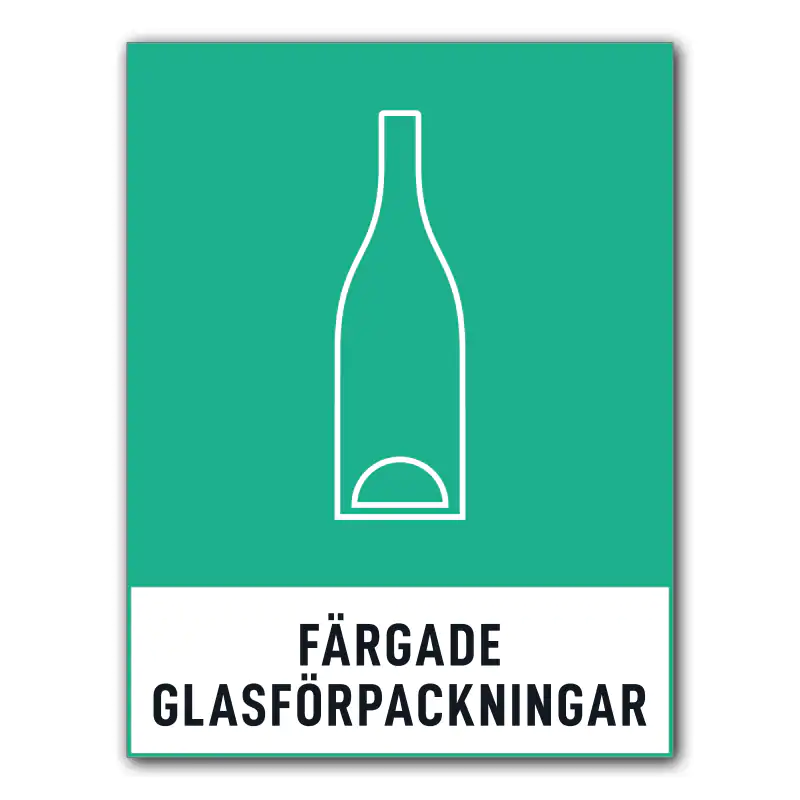 Vår självhäftande återvinningsdekal/skylt med ”Färgade Glasförpackningar” är tryckt enligt Avfall Sveriges officiella standard. Dessa är laminerade för att tåla slitage, väderpåverkan och uv-strålning. Används till uppmärkning av kärl för att underlättar till en korrekt källsortering. Passar allt från hemmet, kontor, BRF, soprum, återvinningscentral och kan monteras både inom- och utomhus.