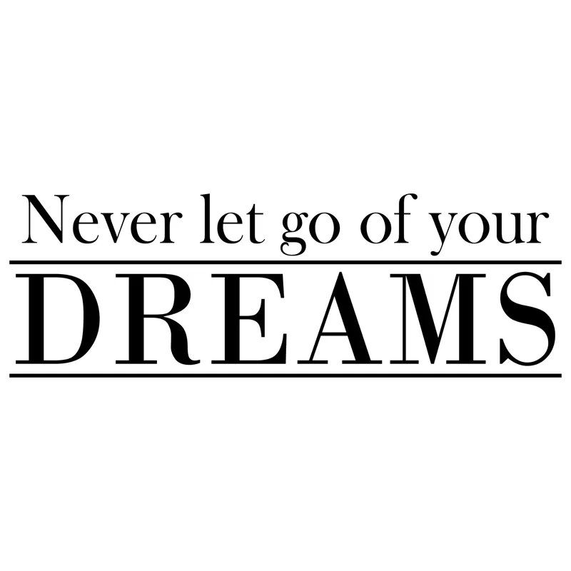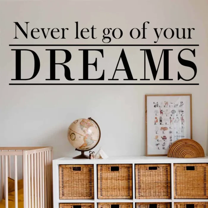 Ge dina drömmar en plats att frodas med vår väggdekor i vinyl. Med den inspirerande texten ”Never let go of your dreams” kommer du att påminnas varje dag om att hålla fast vid dina drömmar och sträva efter det du önskar mest. Vår väggdekor är enkel att applicera, hållbar och lämnar inga spår när du tar bort den. Skapa en motiverande atmosfär i ditt hem eller på kontoret och låt dina drömmar bli verklighet.