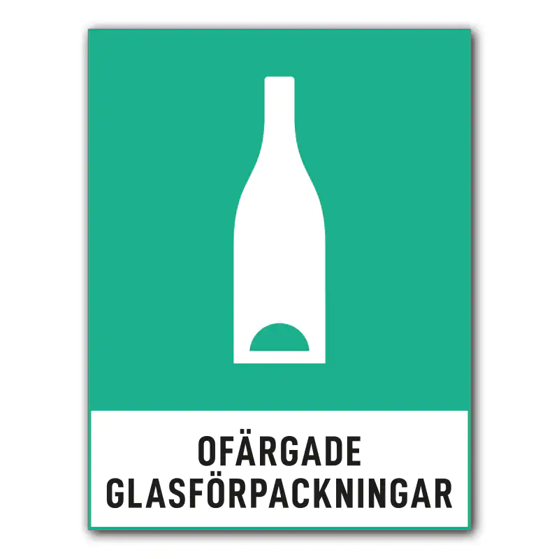 Vår självhäftande återvinningsdekal/skylt med ”Ofärgade Glasförpackningar” är tryckt enligt Avfall Sveriges officiella standard. Dessa är laminerade för att tåla slitage, väderpåverkan och uv-strålning. Används till uppmärkning av kärl för att underlättar till en korrekt källsortering. Passar allt från hemmet, kontor, BRF, soprum, återvinningscentral och kan monteras både inom- och utomhus.
